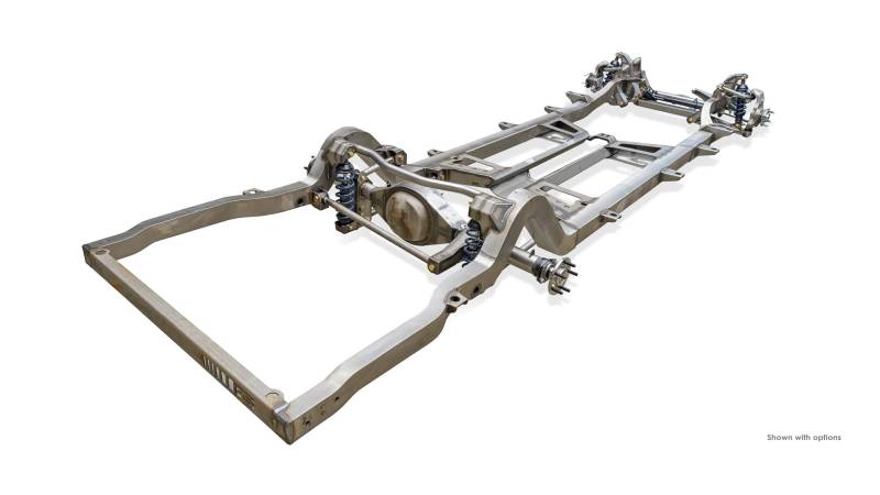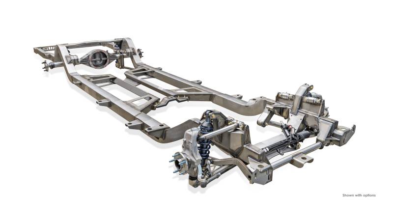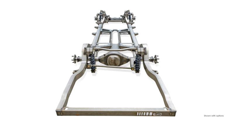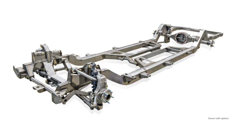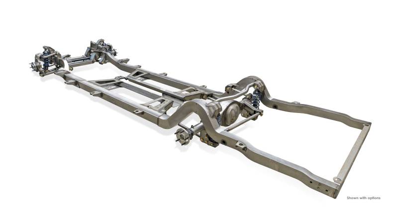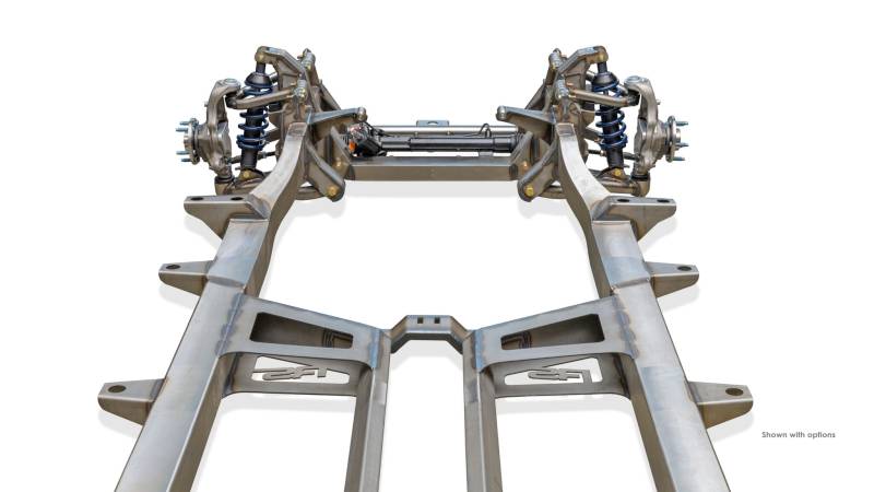 For unparalleled strength, the 1959-1964 Cadillac FAST TRACK chassis is built around our hand fabricated 10ga., 4″ X 4″ frame rails. The chassis is then assembled in our dedicated fixture and TIG welded together with a custom fully welded, double-stack, mid-brace crossmember with an adjustable drop-out transmission bracket. Fabricated exhaust ports are incorporated into the mid-brace and easily allow clearance for up to 3″ exhaust tubing.
