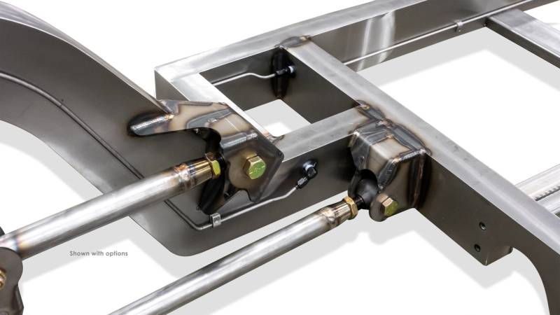 Our Cuda / Challenger FAST TRACK chassis are built based on a hand fabricated 10ga steel, fully boxed frame rails. The main rails and custom mid crossmember feature an adjustable drop out transmission mount which has been specifically designed to aid installation by requiring very minimal floor pan modification while still utilizing the factory body mounts and the original bumper and core support brackets.
