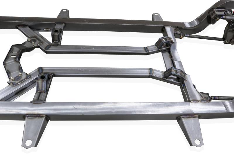 In order to gain the required strength needed, the FAST TRACK Impala chassis starts with hand fabricated 10ga. fully boxed perimeter rails. The main rails have been specifically designed to aid installation by requiring very minimal floor pan modification while still utilizing the factory body mounts and the original bumper and core support brackets. The design of the perimeter chassis also makes routing a performance exhaust much easier, while maximizing structural rigidity throughout by eliminating the rotational loading that the original chassis design is susceptible to.