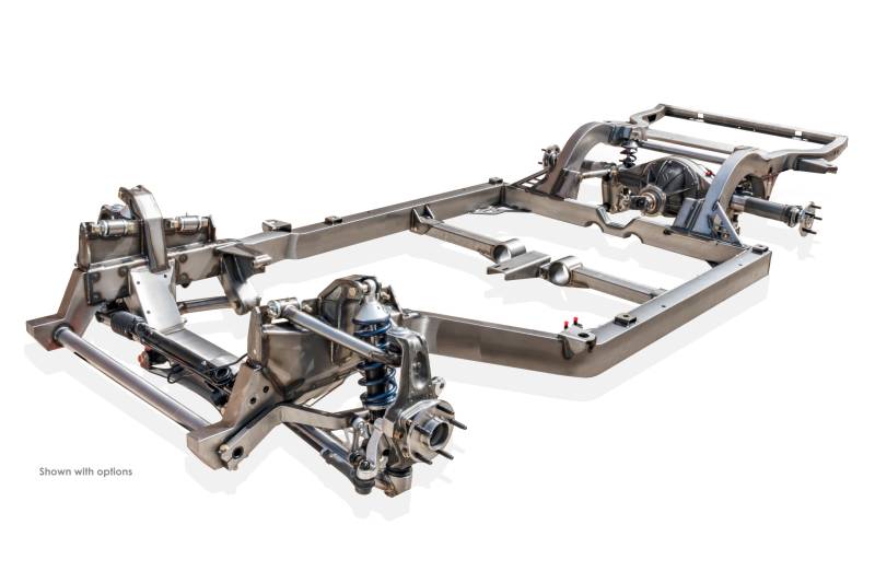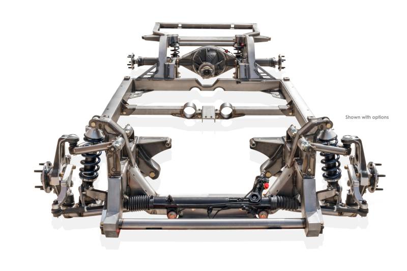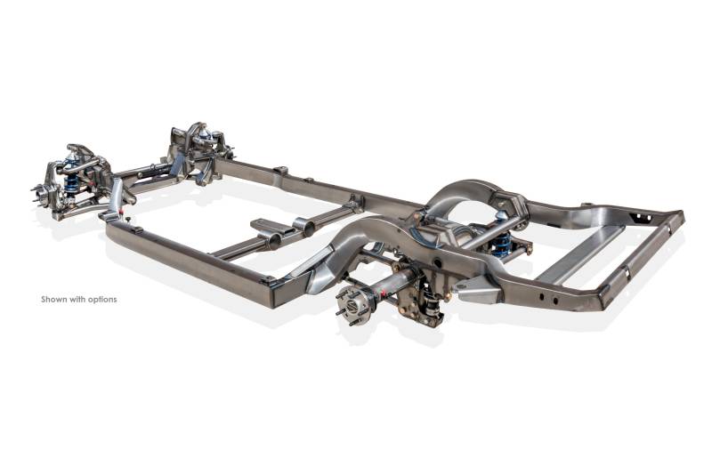 The Corvette Fast-Track chassis starts as fully hand fabricated 10ga. boxed frame rails giving you the strongest platform to base your project upon, eliminating the concern of fiberglass body damage due to chassis flex. To simplify installation the chassis is designed to use the factory body mount locations, bumper and core support mounts. The C-2 Chassis has been designed with a center crossmember with an adjustable drop-out transmission mount and a Tig welded mid-crossmember with styled exhaust ports for up to a 3″ exhaust.