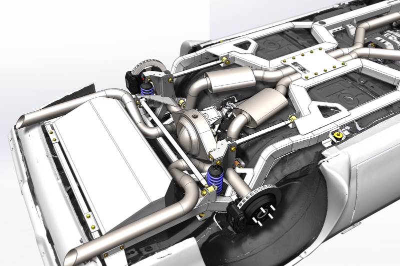 High-resolution 3D scanning has enabled the Roadster Shop to create an exact model of the original Camaro floor pan and undercarriage. 3D scanning combined with the introduction of the RS exclusive ‘Laser Rails’, has allowed for a complete CAD design of an entirely new chassis system that can contour exactly to the Camaro floor pan. All stock mounting points are utilized for a truly bolt-on application with ZERO floor modifications or need to remove the existing rear rails.