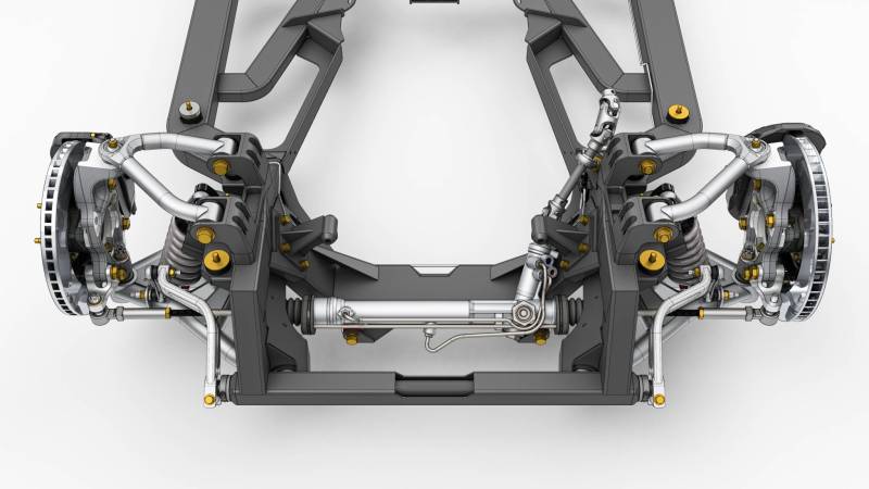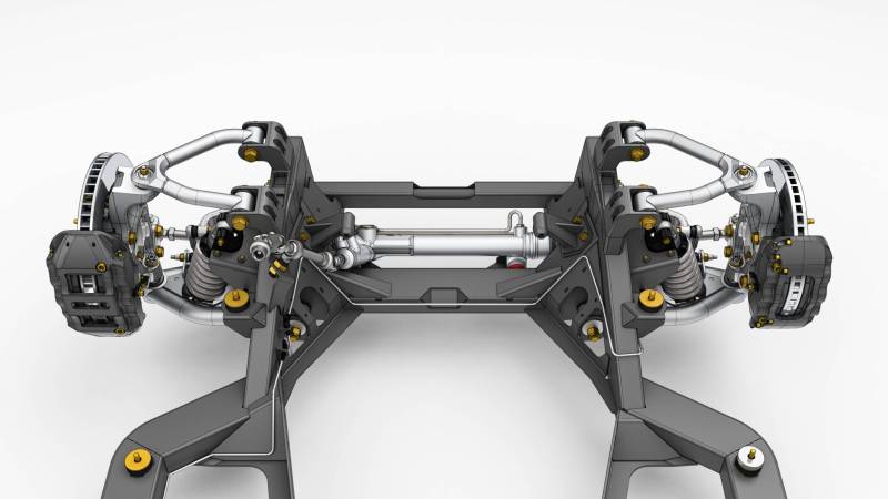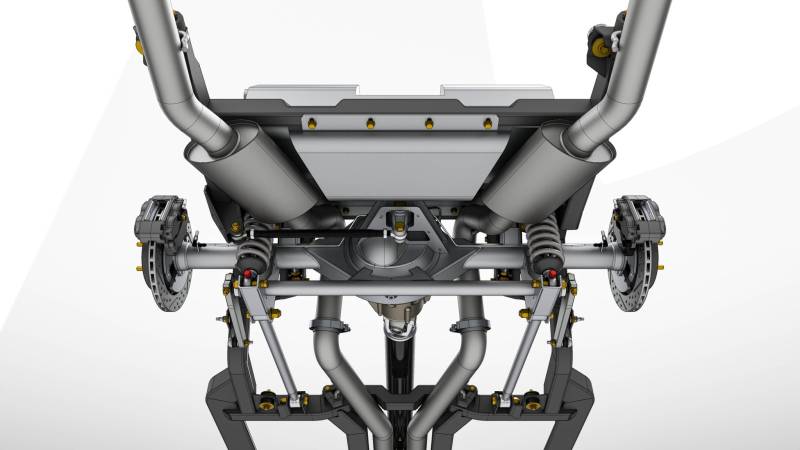 Beyond suspension, the SPEC Chassis is a full frame solution that bolts directly under the unibody. The system lowers ride height and still matches factory ground clearance while dramatically increasing rigidity compared to pieced-together aftermarket solutions. Engineering attention was given to every detail, from bounding box room for steering linkage, headers, and common oil pans to exhaust routing with clearance for a true dual exhaust that can be tucked cleanly under the car.