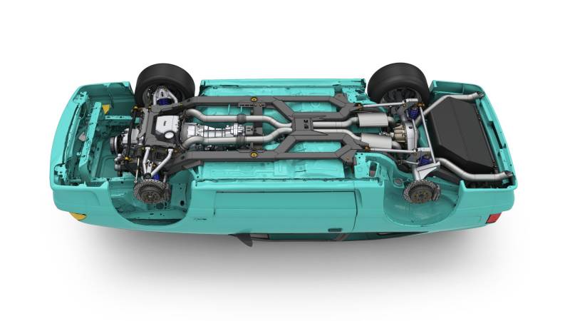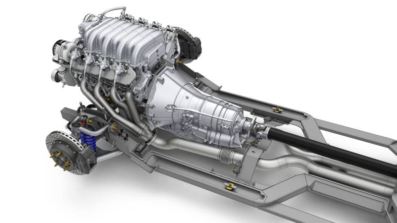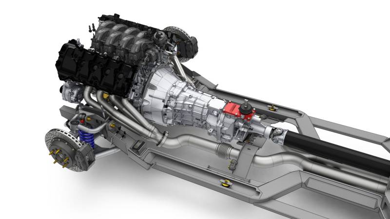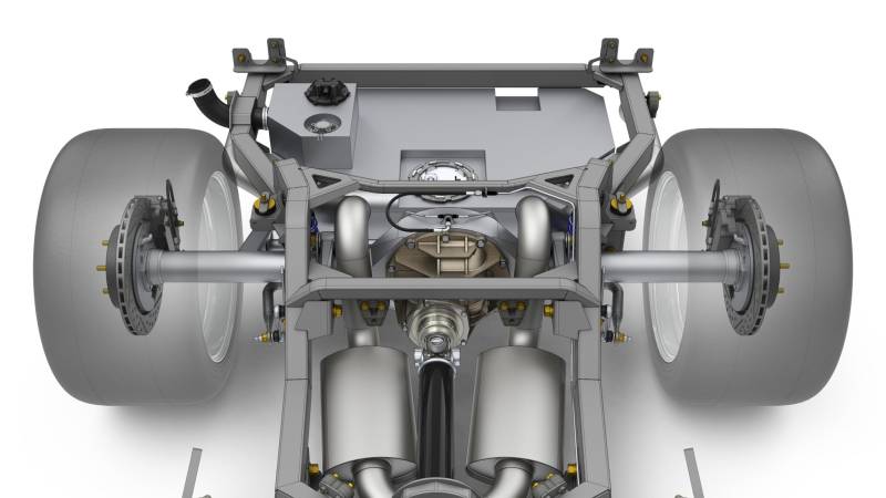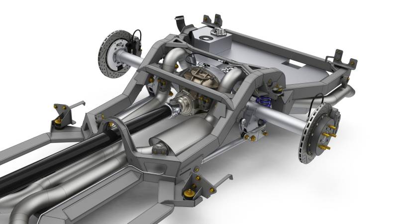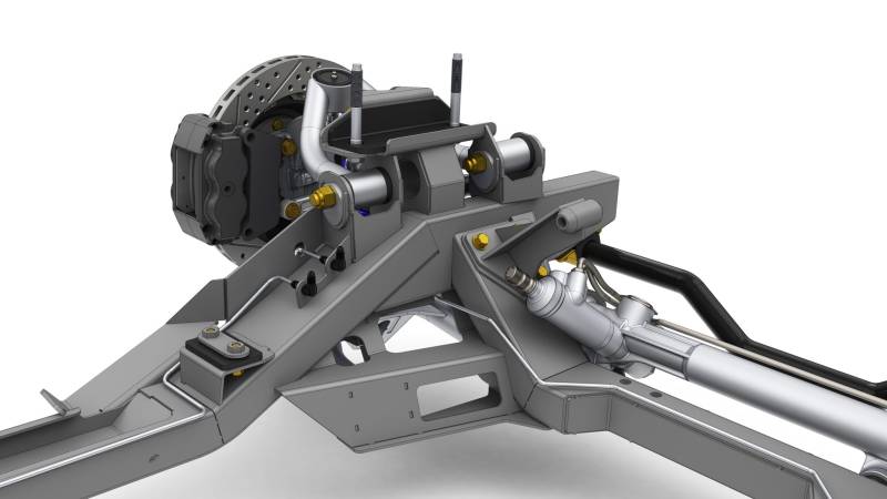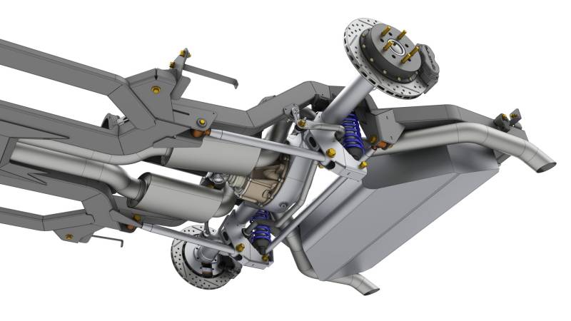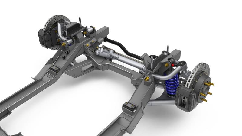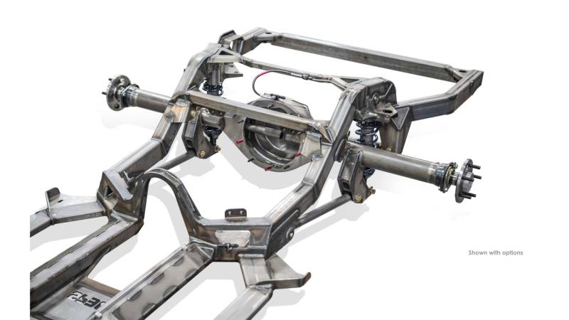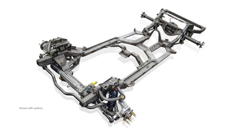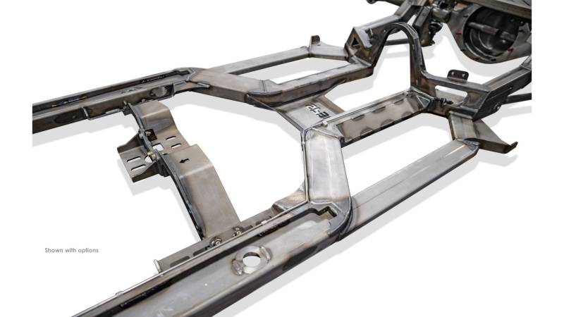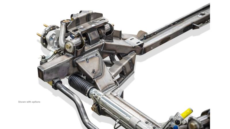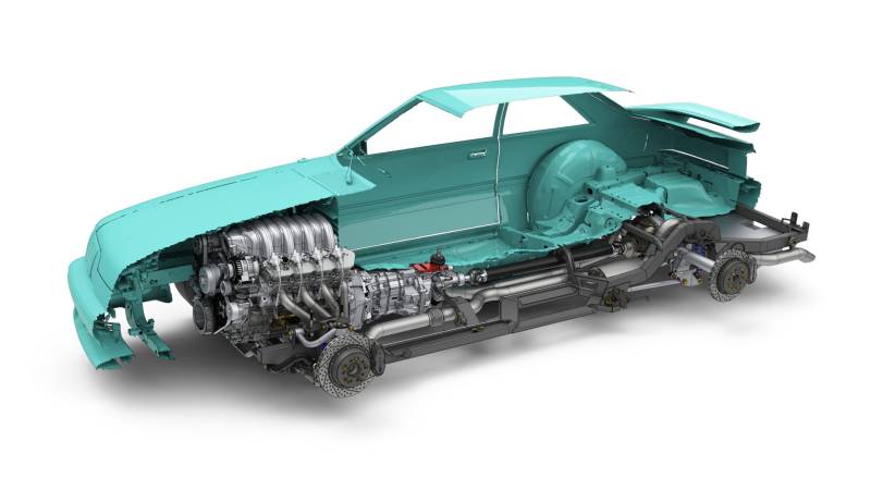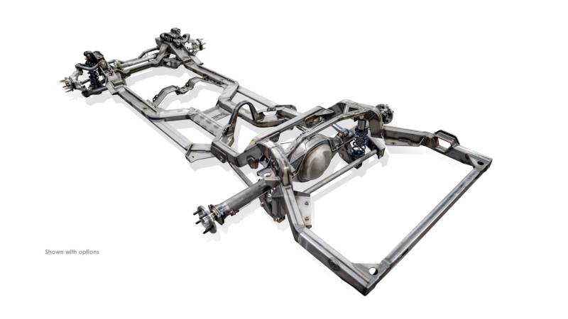 The all-new Roadster Shop Fox Body Mustang SPEC Chassis focuses on the development of a 100% bolt-on chassis and suspension system, designed for ease of installation and enhanced performance. This is the only complete integrated solution that solves all of the shortcomings of trying to build a Fox Body to today’s standards. The bolt-on chassis requires no floor or body modifications, fitting popular drivetrains like the Coyote, Godzilla, EFI SBF, and LS/LT engines. A new SLA independent front suspension system optimizes camber gain, providing better handling and fitment for wider wheels. Eliminating the factory strut towers yields more engine bay room and superior suspension geometry. The parallel 4-link rear suspension replaces the original Ford 8.8 axle with a more robust Ford 9” axle, supporting larger tires and better exhaust clearance. The optimized stance lowers the car beyond the capabilities of current bolt on suspension components, but retains higher ground clearance under the car while also improving room for exhaust systems. Additionally, exhaust, headers, and suspension components are designed to fit seamlessly with no major modifications, while various accessory fitments ensure compatibility with multiple engine types. This chassis offers a comprehensive upgrade that enhances both performance and ease of installation for Fox Body enthusiasts.