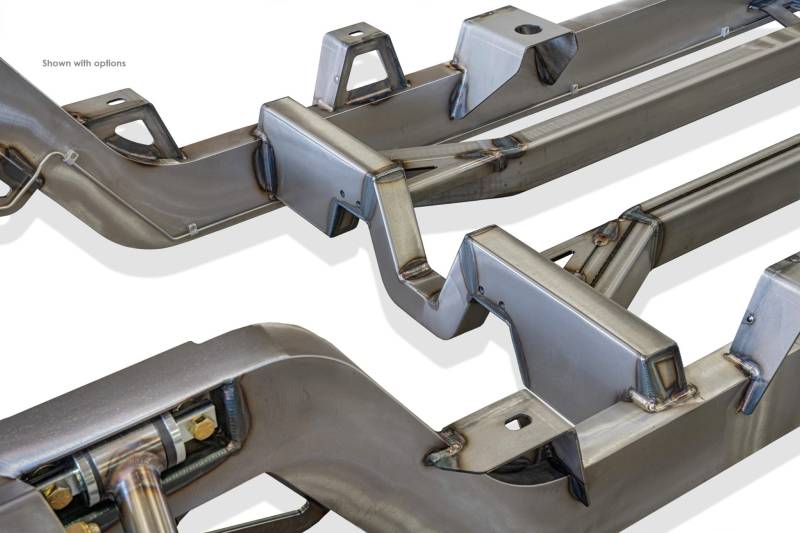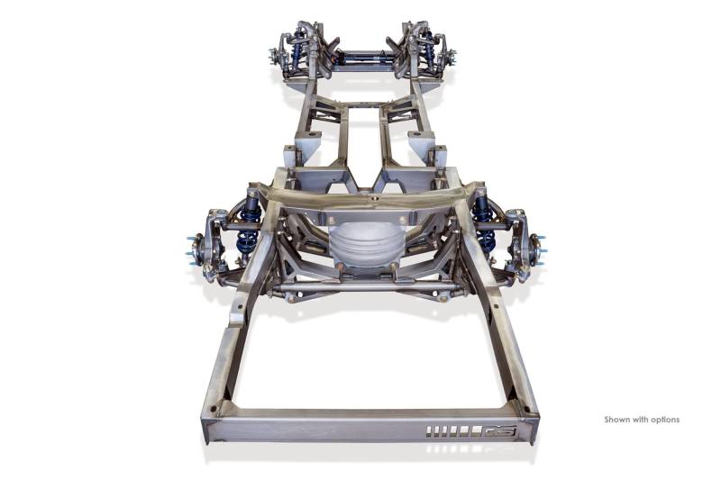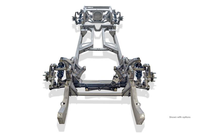 Built in caster and camber settings will allow you to make easy adjustments from street ride quality to track performance settings. The Roadster Shop has carefully designed and engineered 4041 pre-hardened upper and lower control arm mounts, heavy duty splined sway bars that are built into the chassis, and billet aluminum steering arms for strength and weight reduction.
