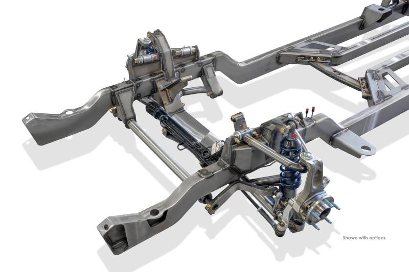 Over 75 individual components make up this all-out performance suspension giving you un-matched proven performance in braking, skid pad, and slalom course, insuring you have what it takes on the street or on the road course. This chassis system utilizes all stock body mounts, bumper mounts, and core support locations for easy installation. The custom fabricated center crossmember and mid brace is designed eliminate flex and twist under heavy acceleration and cornering. Accommodates a full 3″ exhaust and incorporates an adjustable trans mount that works with all of today’s popular transmissions. Out in back the Ford nine inch rear-end and 31 splined axles will defiantly deliver the power to the ground with an optional FAST TRACK Independent Rear Suspension.